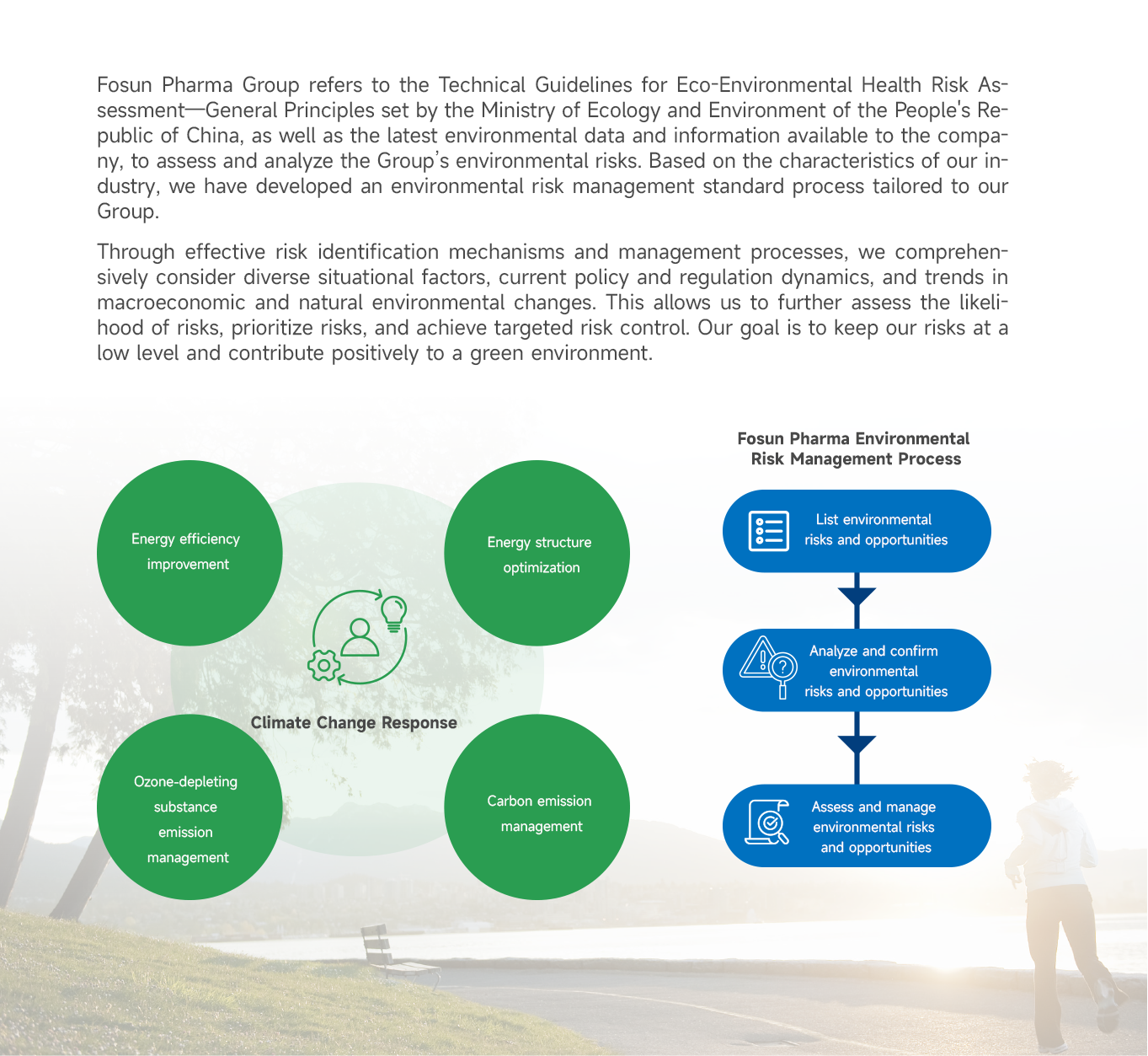 Fosun Pharma is committed to advancing green development and the "dual carbon" strategy in response to the Paris Agreement, actively addressing the challenges posed by climate change. Our environmental protection policy focuses on "pursuing environmental and social sustainability, preventing pollution, actively promoting energy conservation and emissions reduction, protecting ecological diversity, and building environmentally friendly communities," with the goal of fostering harmonious development among companies, society, and the environment and collectively creating a beautiful green home.